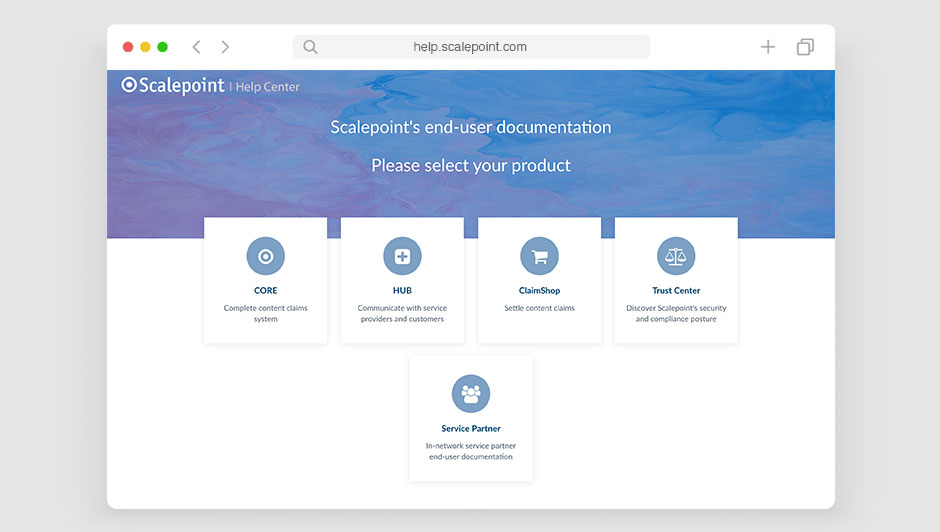 The Help Center is a 24/7, online self-service portal for Scalepoint customers to find answers to challenging issues. It lets you quickly help yourself by searching through our end-user documentation for answers or discovering what our products can do, how they integrate with other systems, and how we care for data.